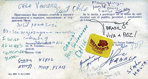 Пригласительный билет на митинг солидарности с Чили, проходивший в рамках Фестиваля молодежи и студентов в 1985 году.