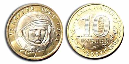 2001 г - 40-летие полета Юрия Гагарина (10 рублей)