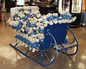 Помните такую песню? А вот в Канаде в канун Рождества эти слова приняты как руководство к действию, причем никто этот призыв не провозглашает с очень высокой трибуны. Во многих магазинах, больших и маленьких, да и вообще в самых разных местах можно увидеть плакат, что принимаются пожертвования - "donations". Например, в магазине Bay стоят вот такие сани с мишутками - можно купить одного и отнести в отдел, а потом его подарят кому-то из детей. | |