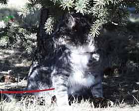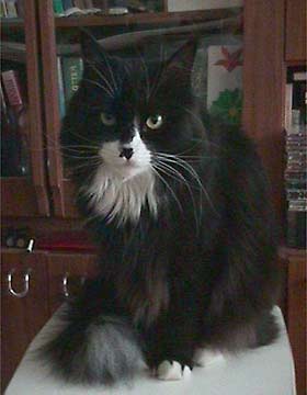![]() Все, кто его видел, не могли не отметить его красоту. У него блестящий мех, кисточки на ушах и даже подошвы лап очень пушистые. А хвост - ну просто замечательный хвостище, особенно когда он его держит "трубой". Кончик хвоста не черный, а как будто седой. |