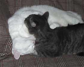 | Первые дня три они прятались: Зави под кроватью, а Зиппер - под диваном. Потом постепенно привыкли и освоились. Хорошо, что их двое - им не скучно вместе, когда нас нет дома. Их даже спокойно можно оставлять одних на 3-4 дня, с запасом еды и воды, конечно. По сравнению с Котиным , - их характеры - почти ангельские, и когти они почти не выпускают. Правда, Зави по утрам и вечерам очень громко и настойчиво требует выдать ему законную порцию кошачьих консервов, а Зиппер иногда начинает носиться по квартире со страшной скоростью. | ||