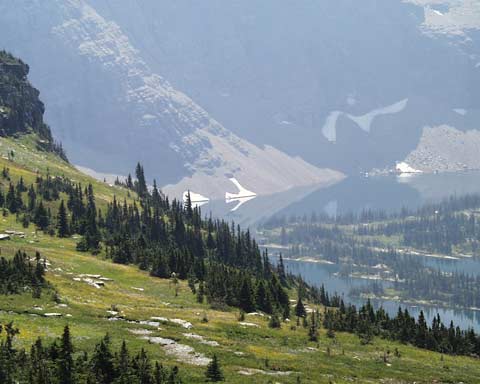 В конце нашей прогулки по перевалу Logan Pass нас ждало это спокойное и красивое горное озеро.