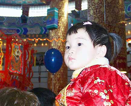 Некоторых маленьких детей привели на праздник в традиционной национальной одежде. В Китае считается, что красный цвет приносит удачу. На красном фоне вытканы золотые узоры.