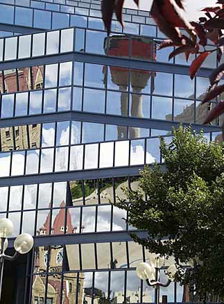 21 сентября 2002 - Отражения старого City Hall-а и Calgary Tower в зеркальных стенах мэрии (это не коллаж, а на самом деле)