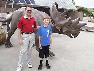![]() Уже у входа в музей вас встречают огромные фигуры динозавров... Из-за того, что от самого Калгари за нами по пятам гналась гроза, мы быстренько сфотографировались с ними и спрятались от дождя в самом музее. |