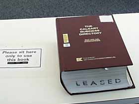 В этой книге, которая называется The Calgary Business Directory, находятся сведения обо всех компаниях в Калгари – название, координаты, число работающих, имя начальника – владельца. Можно из нее только переписывать нужные сведения, копировать нельзя – она ведь вместе со столом. А так как компаний в Калгари немало – толщина книги сантиметров 20, не меньше. В три захода я переписала более-менее нужную мне информацию по графическому дизайну и вывескам. | |