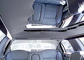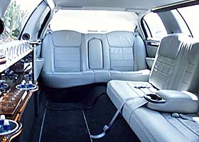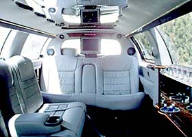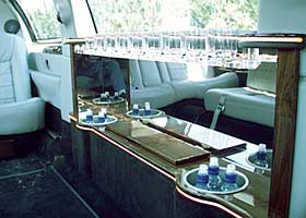 А это вид спереди-назад. Справа по борту (по ходу) находится зеркальный бар с холодными прохладительными напитками и стаканами. Правда... напитки в баре все исключительно безалкогольные - т.к. по правилам в салоне не должно находиться никаких алкогольных напитков, и даже пива - а если найдется раскупоренная бутылка или банка - тогда жди неприятностей от полиции... лучше не нарываться... и, к чьему-то сожалению, красиво ехать в лимузине, позванивая бокалами шампанского, не удастся...