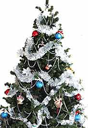 а сверху голубые огоньки. Елку перед домом тоже цветной гирляндой обвили.