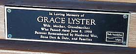 ![]() Несколько слов о скамейке. На ней была небольшая табличка с надписью: " На добрую память о Грейс Листер, жене, матери, бабушке, ушедшей из жизни 8 июня 1998 года. Всегда помнящие ее муж Вес, сыновья Дон и Дейл, и их семьи". |