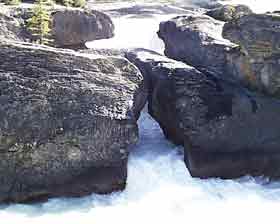| К западу от городка Field на реке Kicking Horse River ("брыкающаяся лошадь") находится этот каменный мост, созданный самой природой. Когда-то это был водопад, но постепенно бурная река "пропилила" скалу и пробила себе путь пошире под скалой, оставив над рекой этот мост длиной в15 метров, по которому можно без труда перейти реку, не без опаски поглядывая на бурлящую, молочно-белую от пены и мельчайшего ила (от размываемых ею по пути горных пород) воду слева и справа от моста. | ||||