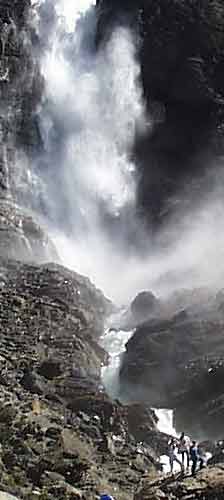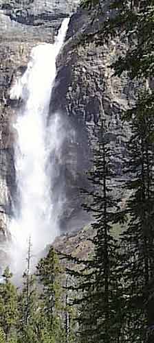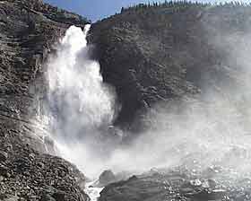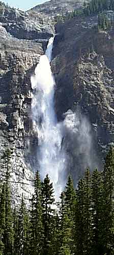 водопада - "всего" 56 метров). На самой вершине этой горы, на высоте 381 метр над уровнем моря, есть небольшое озеро, которое питается водой ледника Daly, в свою очередь, являющегося нижней частью большого ледника Waputik. Если считать всю эту высоту - от начала водопада до его впадения в пенистую реку Йохо, то высота водопада (как и указывается в некоторых источниках) - 381 метр. Летом, когда ледник тает наиболее интенсивно, струя водопада достигает своей наибольшей мощности - кто знает, сколько тонн воды в минуту низвергается со скалы? А к осени, когда таяние снегов прекращается, водопад становится скромнее, зимой превращаясь в узкую ленту, подо льдом ждущую своего освобождения следующим летом. И так (по меньшей мере) сотни тысяч лет... Так что, как видите, индейцы племени Кри ни капельки не ошиблись, дав ему такое громкое название - Takakkaw! |